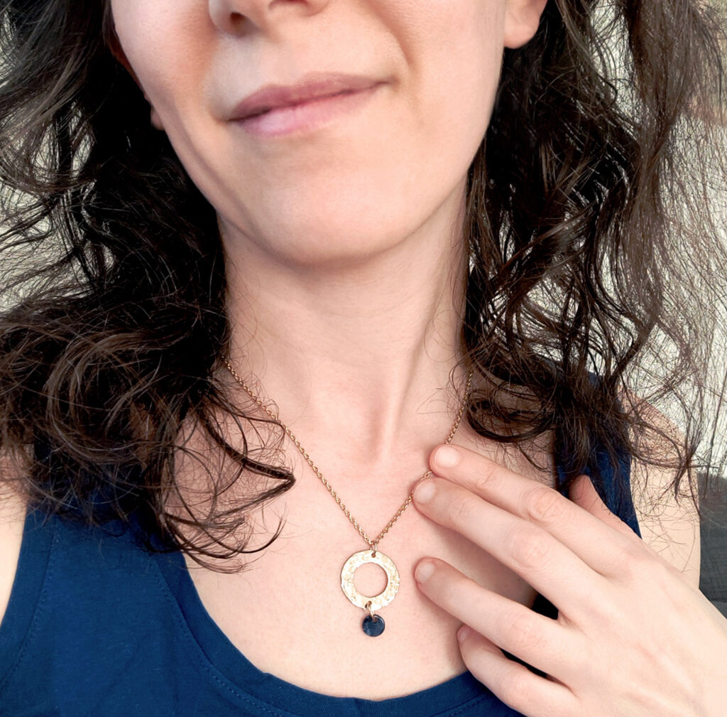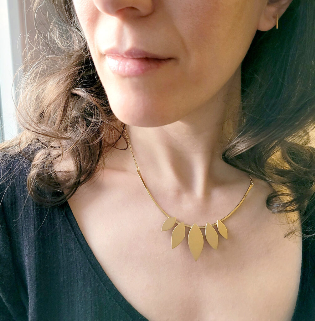 La même variété se retrouve dans ses créations et les techniques utilisées pour les fabriquer : assemblages simples en perles, travail du métal ou encore gravure traditionnelle à l’eau-forte.